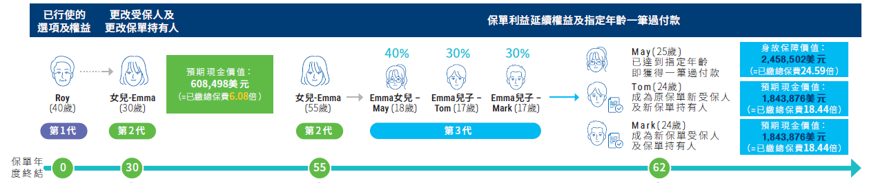 作為一家之主的Roy,理財的目的不止著眼於目前,更期望將財富世代傳承,所以他在40歲時投保富饒千秋儲蓄計劃,2年間合共供款10萬美元。保單經過多年滾存增值,Roy於女兒Emma 30歲成家之時,將保單轉予Emma名下,當時保單的現金價值已達608,498美元16。