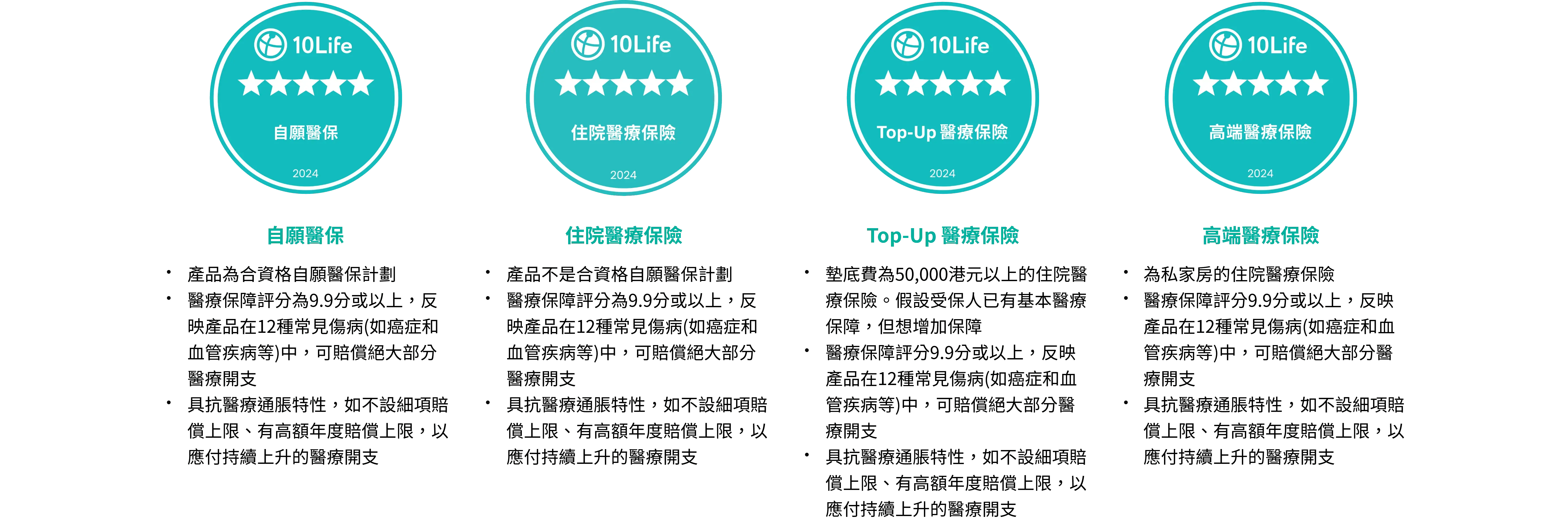 10Life檢視多個健康相關的保險類別,包括定期危疾、終身危疾、自願醫保(普通房、半私家房和私家房)、高端醫療和Top-up保險,而獲奬的保險公司在多個產品類別中得到5星評級,取得認可的產品類別較同業廣泛,反映該保險公司在健康相關領域產品可提供較優質的保障