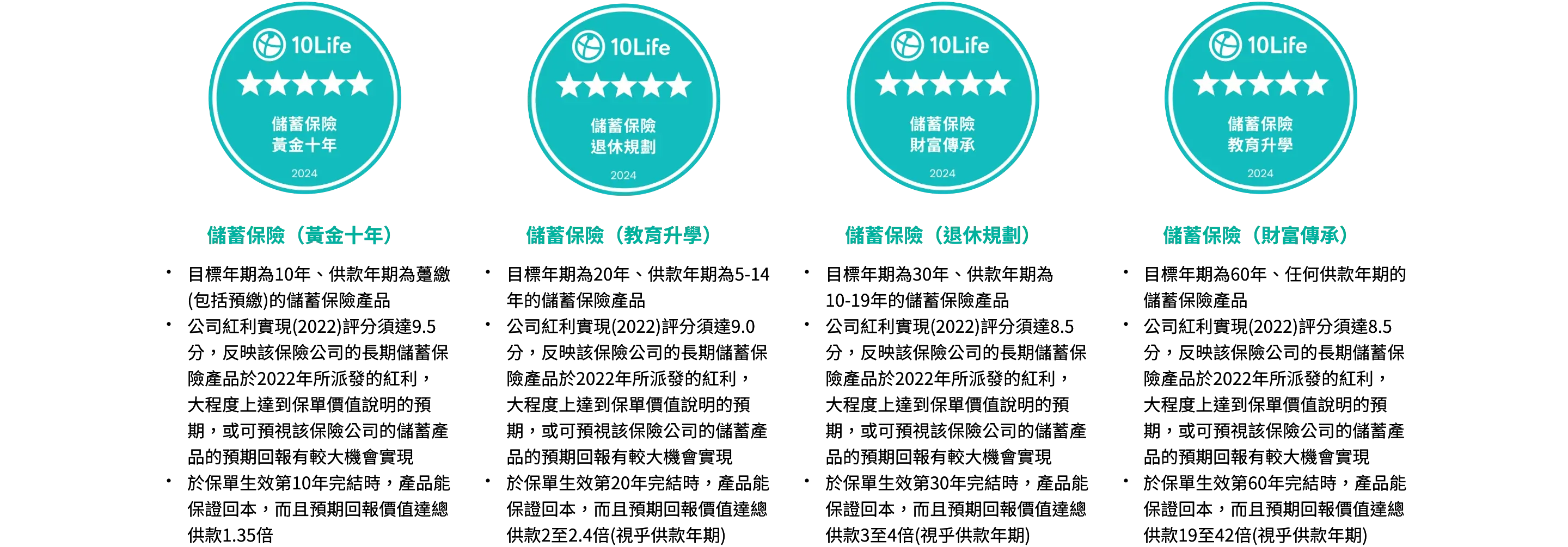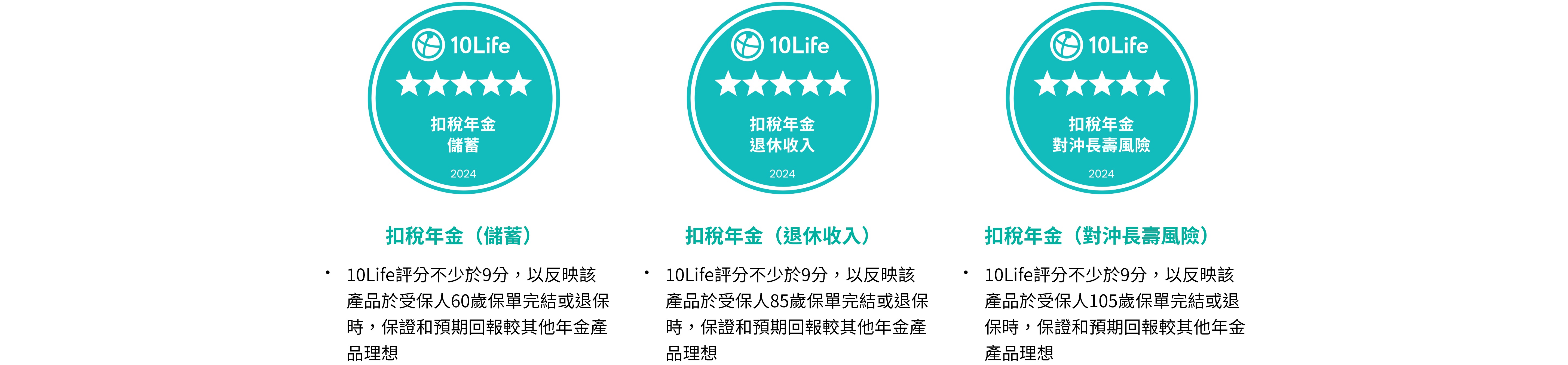 10Life檢視多個財富相關的保險類別,包括即期年金、扣稅年金(儲蓄、退休收入、對沖長壽風險)、儲蓄保險(黃金十年、教育升學、退休規劃、財富傳承),而獲奬的保險公司在多個產品類別中得到5星評級,取得認可的產品類別較同業廣泛,反映該保險公司在財富相關領域產品大致可提供較理想的回報